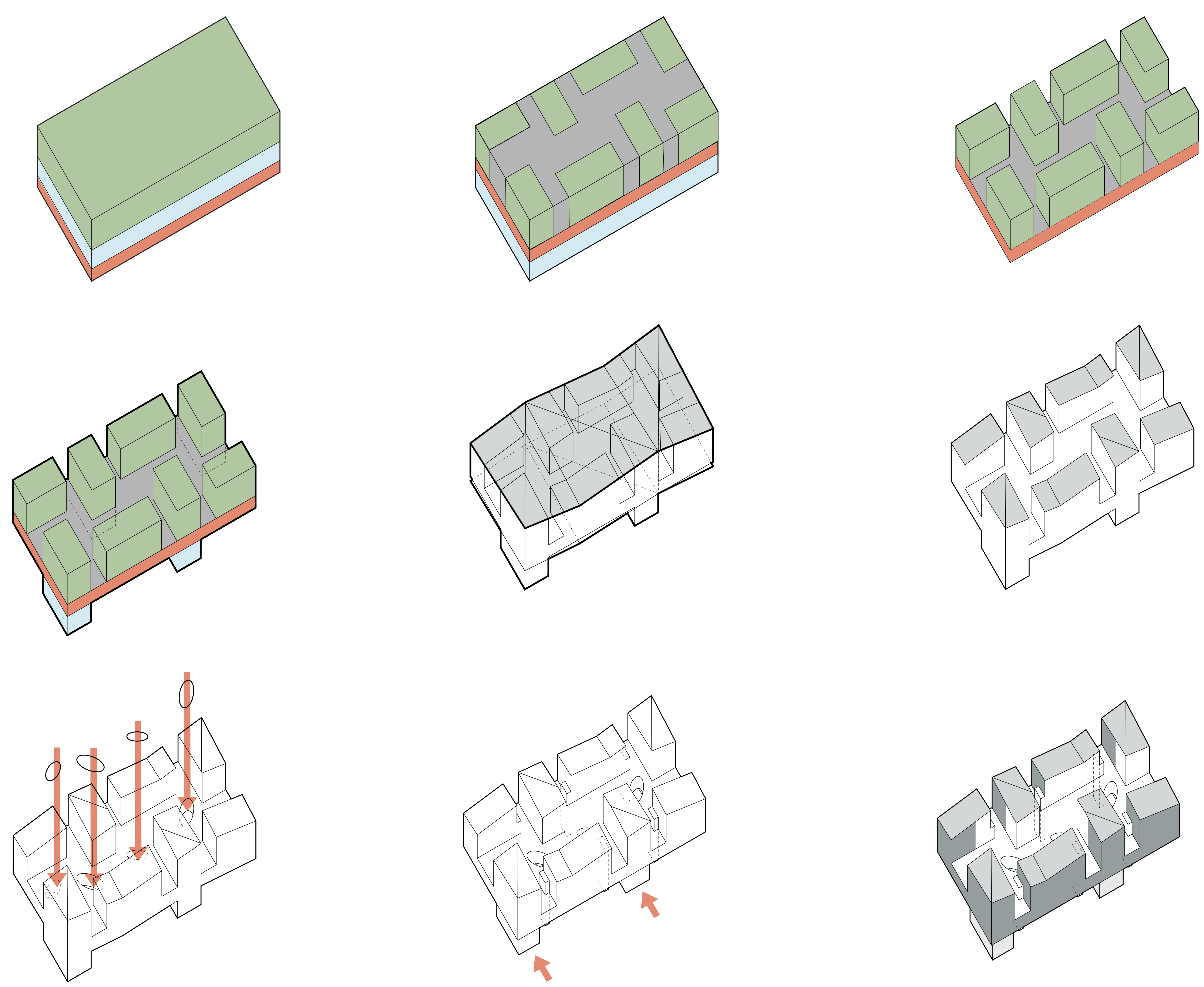 Given a site at Detroit’s Eastern Market, the goal of this project is to celebrate the vibrancy of the marketplace, while also providing a peaceful place of refuge for residents. Tasked with creating a large market space, high density housing, and parking for both, our solution was to design a striated massing scheme of different program types, transitioning from public to private.